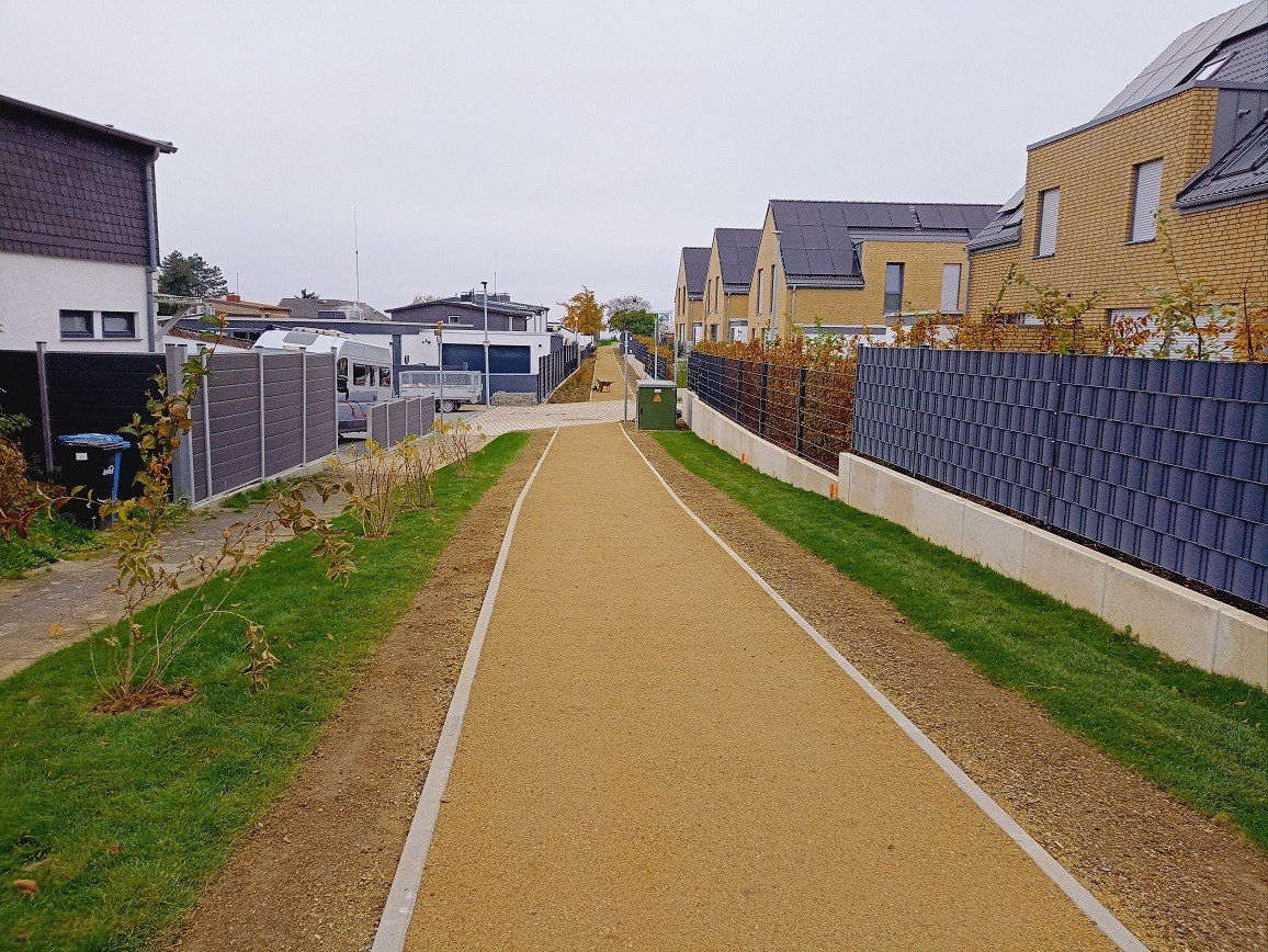 Firma Hendrik Rohleder Landwirtschaftlicher Lohnbetrieb aus Wuppertal war beauftragt mit der Sanierung des Radweges zwischen den Kreuzungen Albert-Schweizer-Weg x Am Steinberg und Krummer Weg x Ropenstall. Der ca. 380 m lange Radweg bekam eine Koersmix Deckschicht: Für die 4 cm dicke Fahrbahn wurden 85 tonnen DurEko-mix BIO geliefert.Galabau Rainer Eschbach aus Much war beauftragt mit der Sanierung des Radweges zwischen der Feuerbachstraße und der Kinderspielplatz "Fester Weg". Der ca. 300 lange Radweg bekam eine Koersmix Deckschicht aus KoMex Gelb, ebenfalls in Einbaustärke 4 cm. Außerdem wurde der Bürgersteig am Fester Weg teilweise mit dem Belag erneuert.