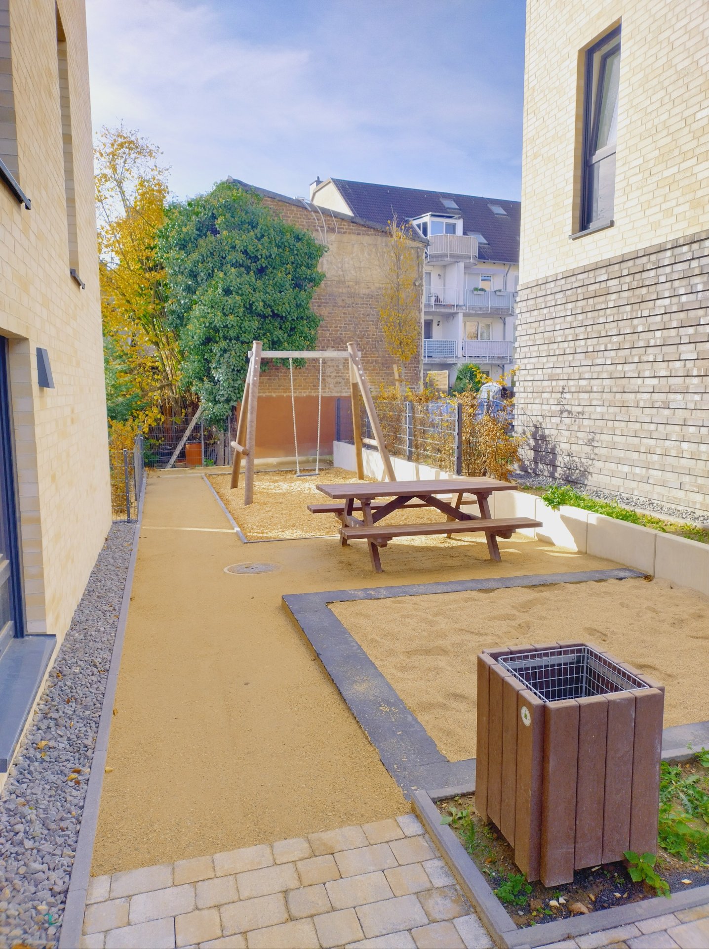 Die Fa. Galabau Rainer Eschbach aus Much hat im Herbst 2025 auf mehrere kleine Spielplätze und Gehwege am Neubauquartier in de Uferstraße in Leichlingen Koers KoMex Gelb Deckschichten eingebaut. Das Quartier umfasst 69 neue Eigentumswohnungen, verteilt über fünf Gebäude und liegt auf wenige hundert metern von Wupper und Stadtmitte entfernt.