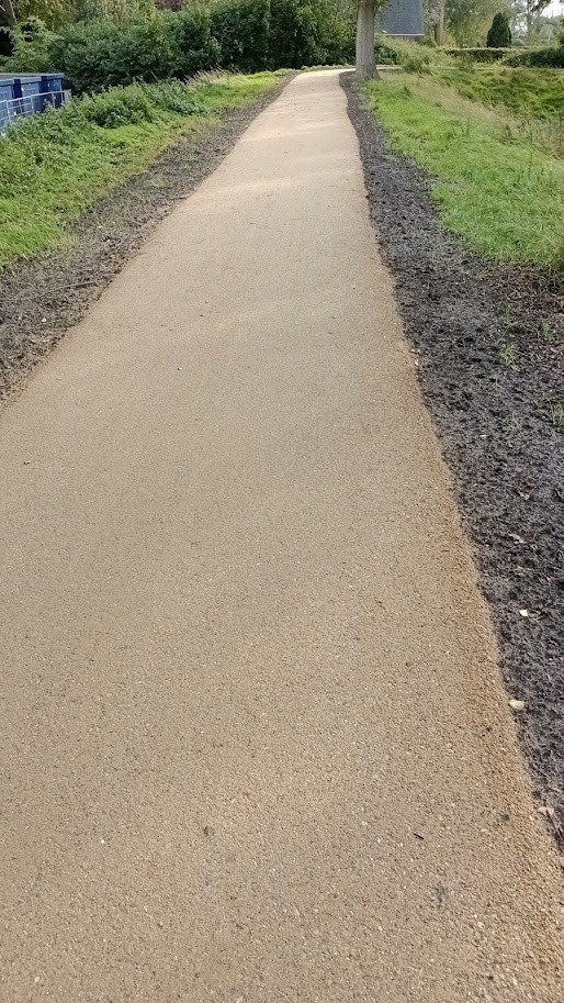 Als Ersatz wurde KoMex Gelb gewählt, ein wasserdurchlässiger Halbbelag mit einer warmen, natürlichen gelben Farbe. Diese Farbe passt hervorragend zur umgebenden Landschaft und zur historischen Deichstruktur, wodurch der Weg optisch weniger dominant ist als Asphalt. Gleichzeitig entsteht ein ruhiges und natürliches Bild, das zum Charakter des Oude Koedijk passt.