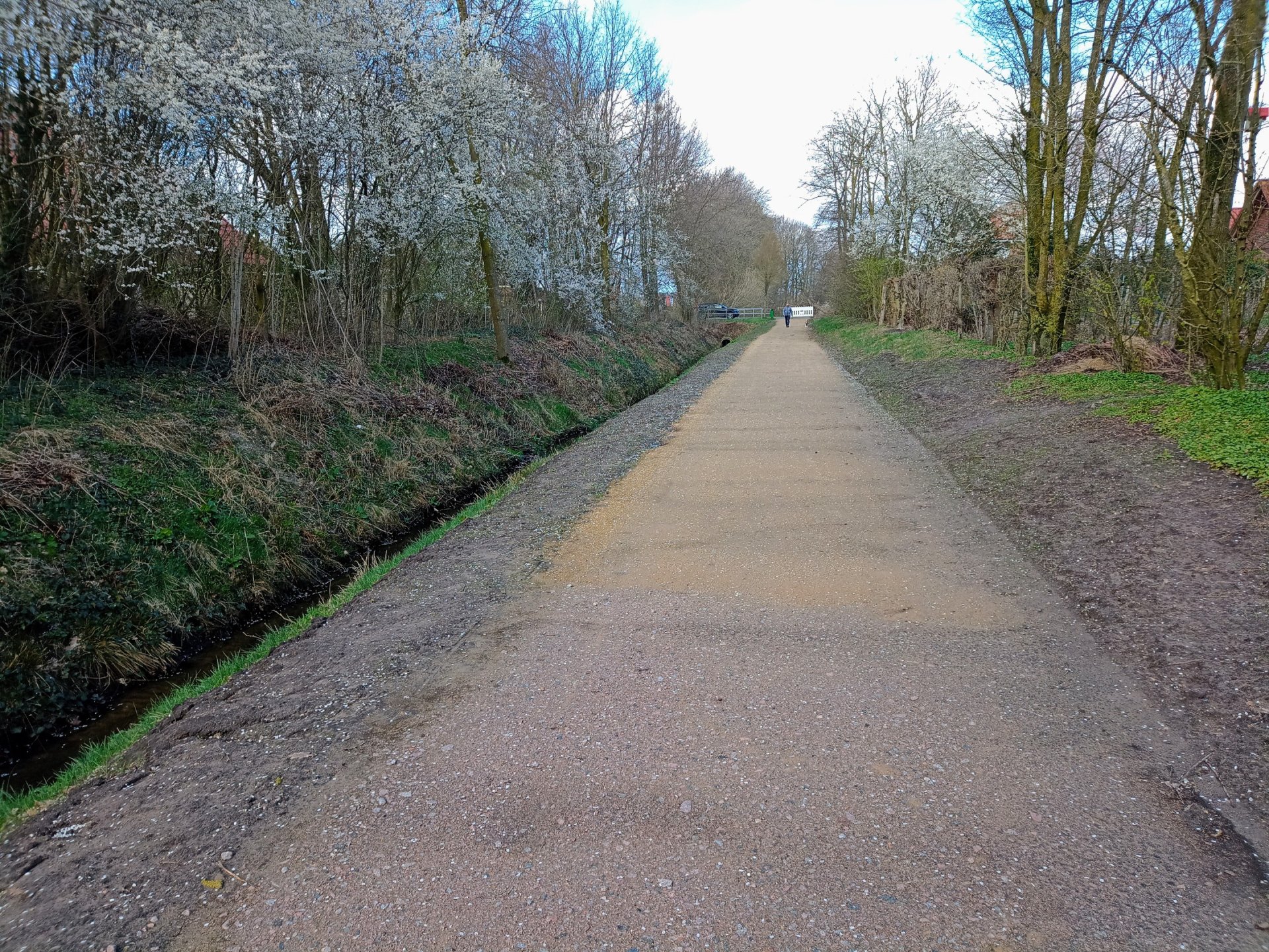 L'entreprise Kemper-Haus Strassen und Tiefbau de Molbergen a reconstruit la piste cyclable et le chemin de randonnée entre la rue Pfarrer-Landgraf et la Fichtestraße sur les côtés est et nord du Roslaes Schloot. Koers KoMex Gelb a été utilisé pour la couche de roulement. KoMex Gelb est un matériau très utilisé dans le district de Cloppenburg. Il a déjà été utilisé à Fildern, sur les chemins de randonnée près du bassin de rétention des eaux de pluie, dans le nouveau quartier de Heidresch à Lastrup, à Essen (Oldenburg) sur le chemin le long du Nadamer Bach et au lac de baignade Halener Badesee à Cloppenburg.