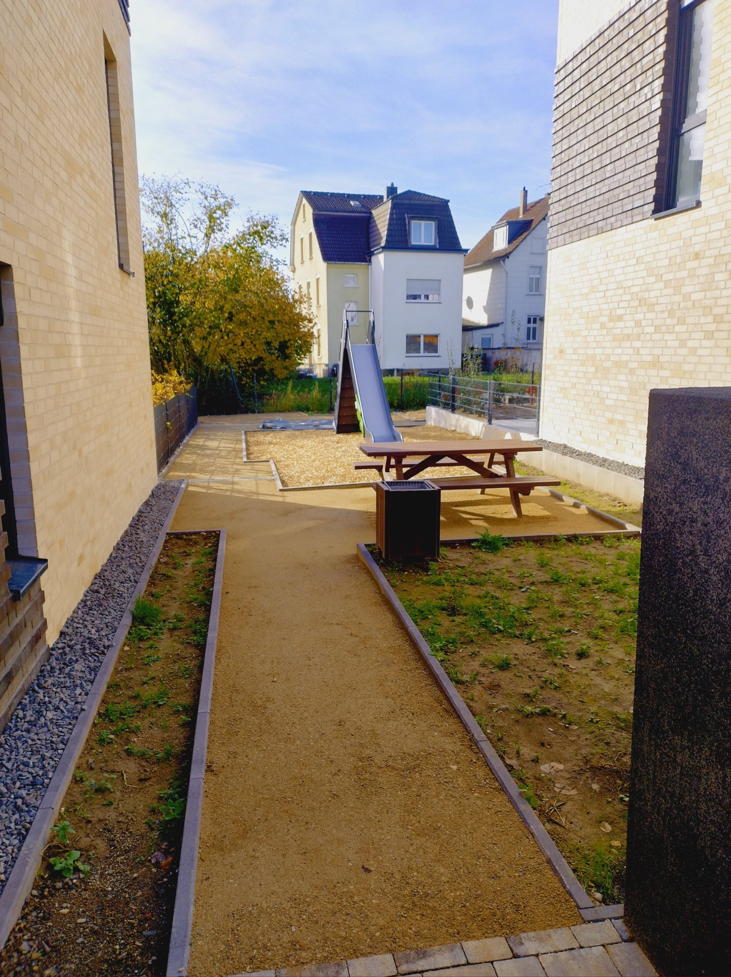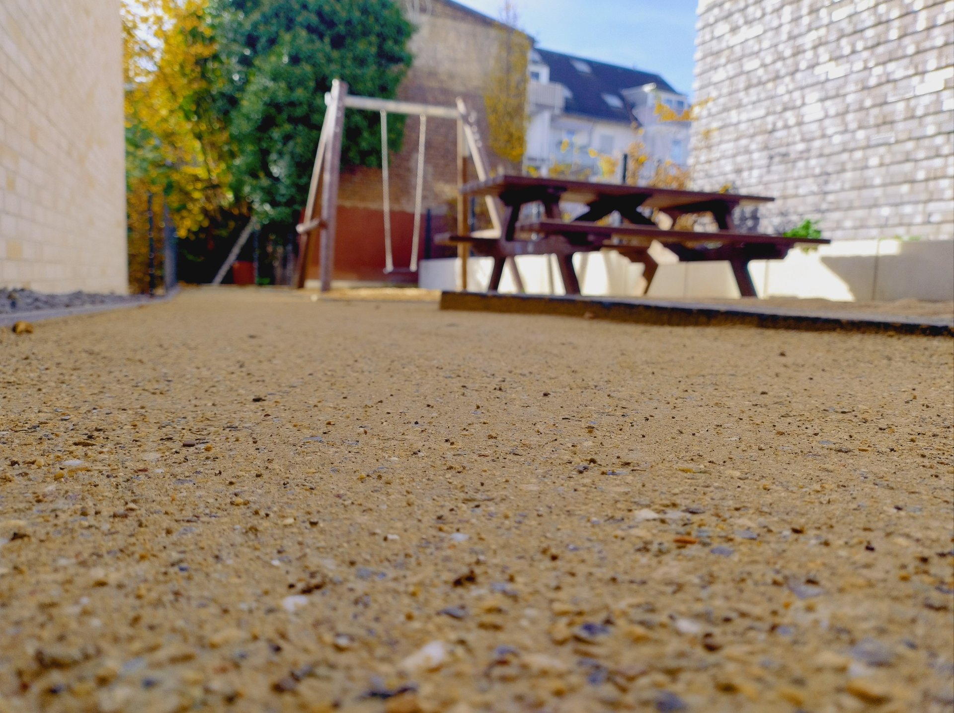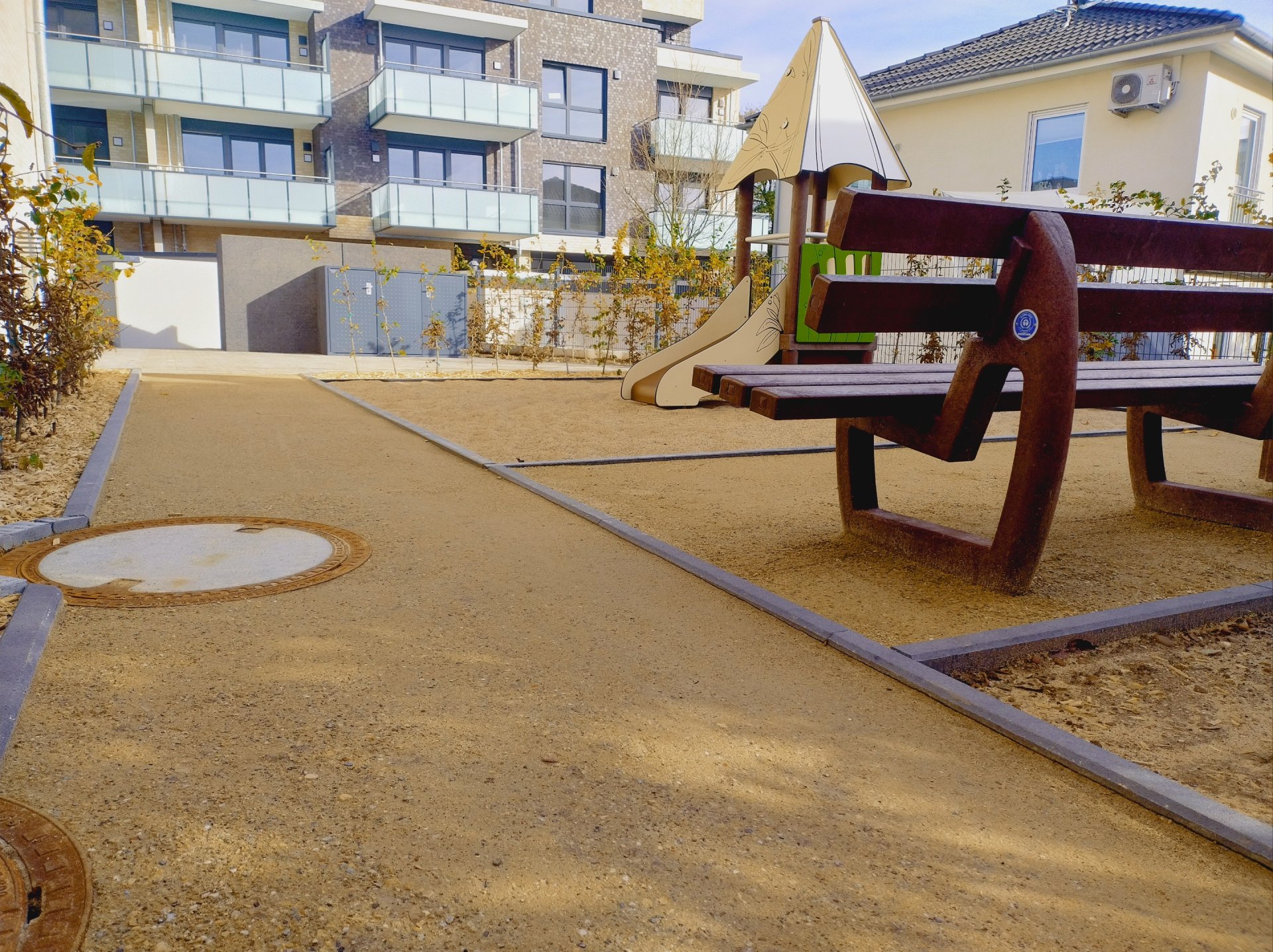 À l’automne 2025, l’entreprise Galabau Rainer Eschbach de Much a appliqué des couches de surface en Koers KoMex Jaune sur plusieurs petites aires de jeux et allées piétonnes dans le nouveau quartier résidentiel de la Uferstraße à Leichlingen. Le quartier comprend 69 nouveaux appartements en copropriété répartis sur cinq bâtiments, à seulement quelques centaines de mètres de la Wupper et du centre-ville.