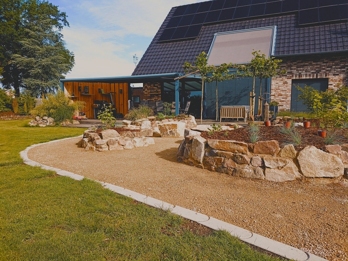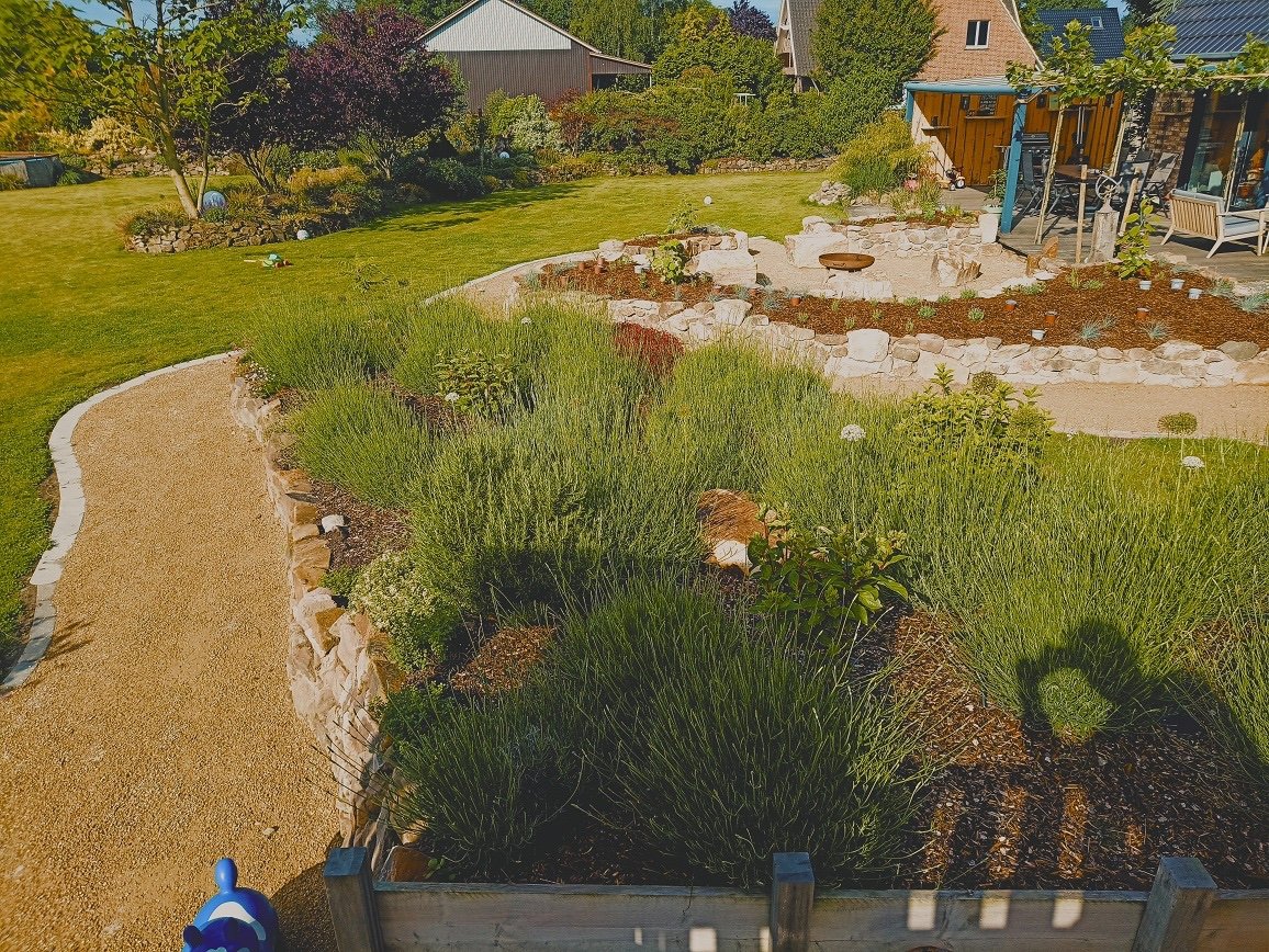 Bijvoorbeeld onze particuliere klant in Lünne, die zijn eigen watergebonden en waterdoorlatende tuinpaden en -terreinen aanlegde met 7 ton KoMex Yellow. Alles gebeurt met de hand: per kruiwagen vervoeren vanaf de parkeerplaats aan de straat naar de tuin achter het huis, gestort, verdeeld en afgeschud. Je hebt technische kennis, sterke spieren, het juiste gereedschap en natuurlijk vorstvrij en droog weer nodig.